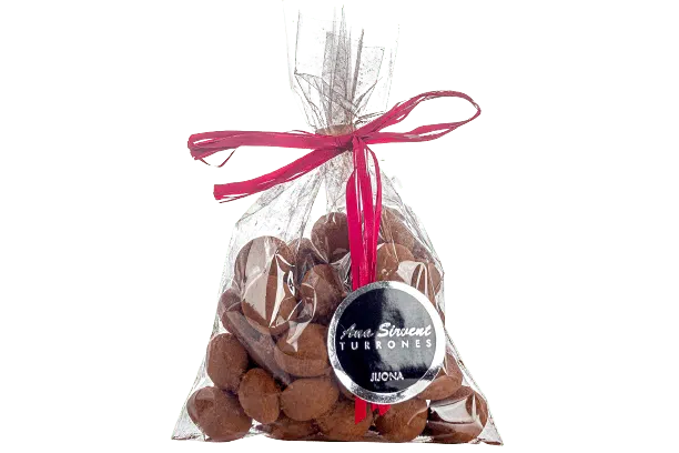 Almendramarcona tostada con una fina capa de caramelo crujiente, seguida de chocolate blanco y envueltas en polvo de cacao. sin duda la reina de las grageas.