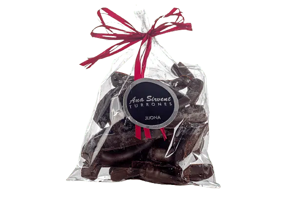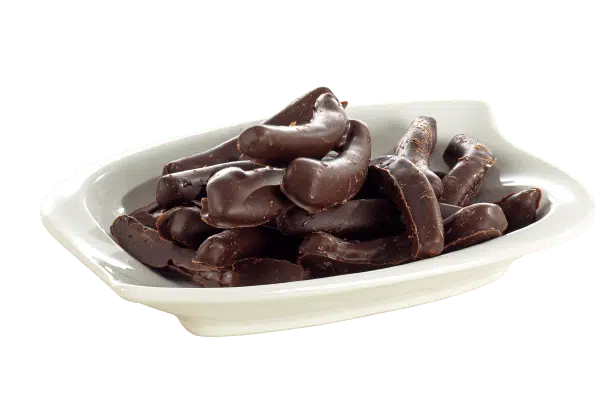 Corteza de naranja confitada bañada con una ligera capa de chocolate puro. No se puede comer solo una.